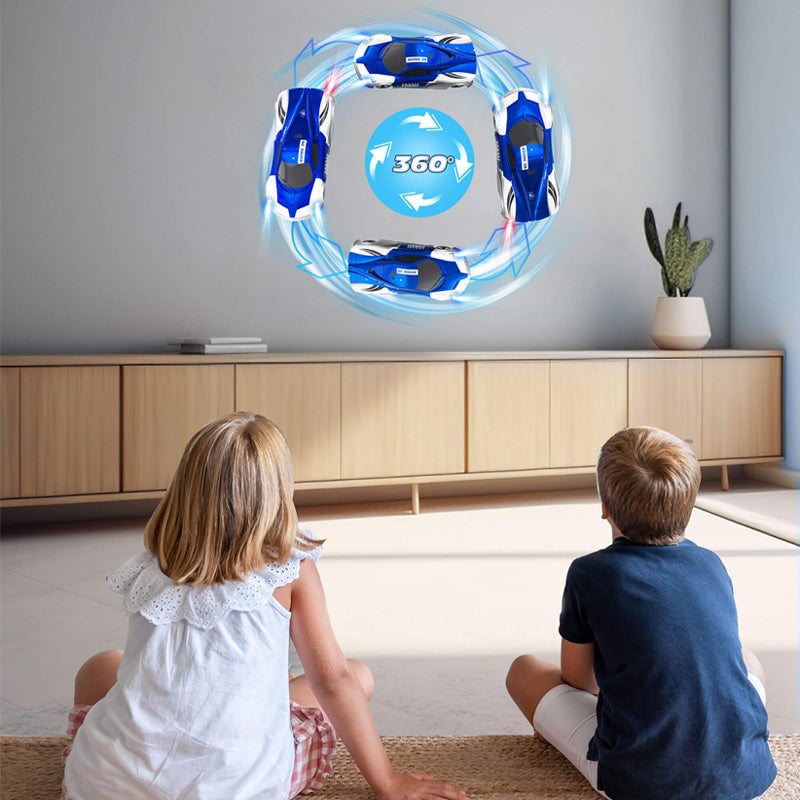 【LED Car Light & Rechargeable】This RC stunt car has auto-switch LED lights that can bring sensory stimulation and create endless fun for 4-12 year old kids. The battery is charged via USB, which is fast and convenient. The remote controller requires 3 x 1.5V AA batteries (Not included)
